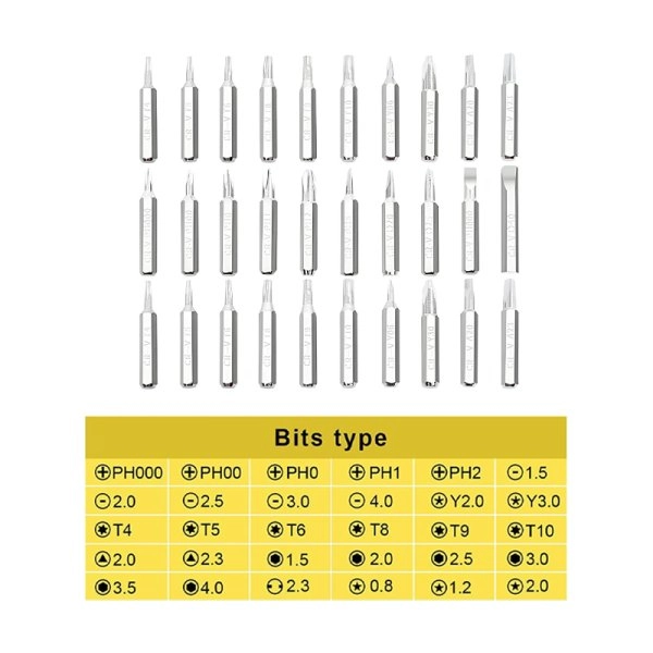 Precision screwdriver including a handle, 30 bits, an extension and a transport box.
